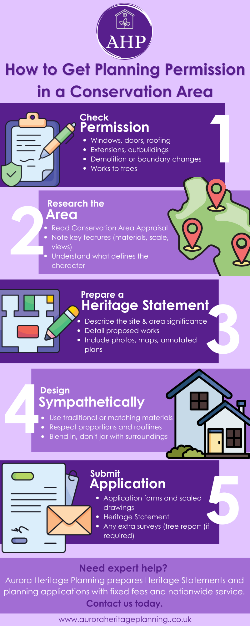 In this guide, our team at Aurora Heritage Planning – specialists in conservation and heritage planning – share a simple step-by-step process to help you secure planning permission in a conservation area. You’ll learn how to avoid common pitfalls, prepare stronger applications, and get expert support along the way.